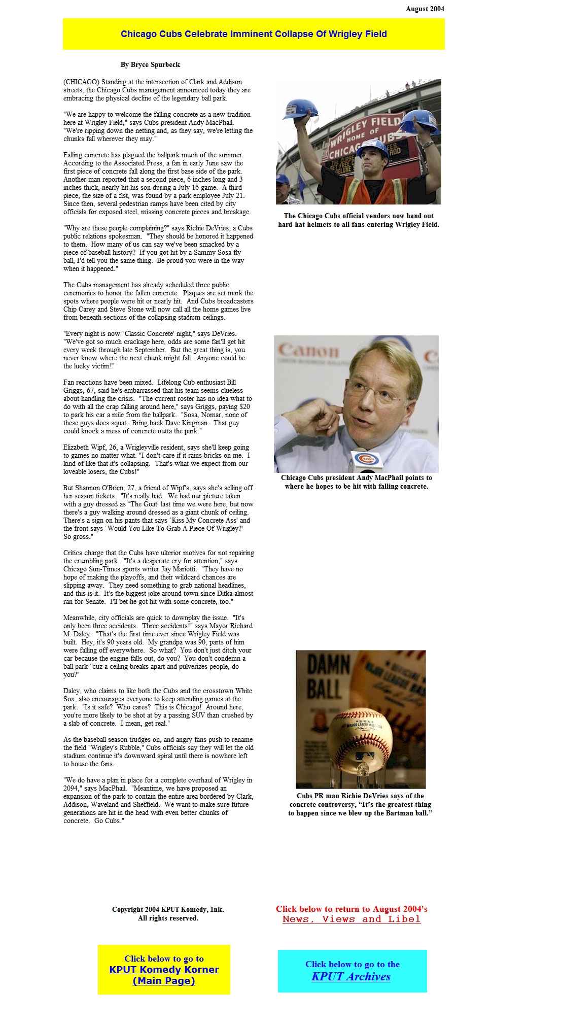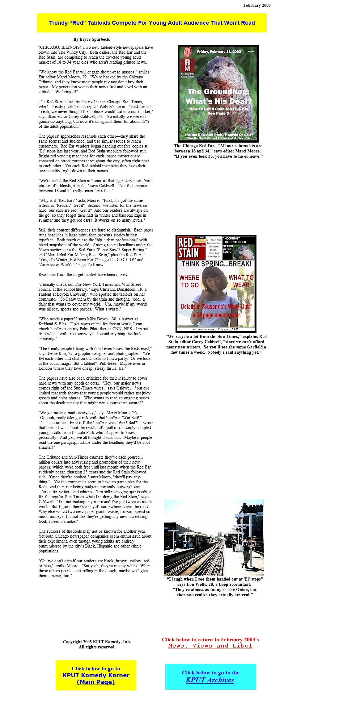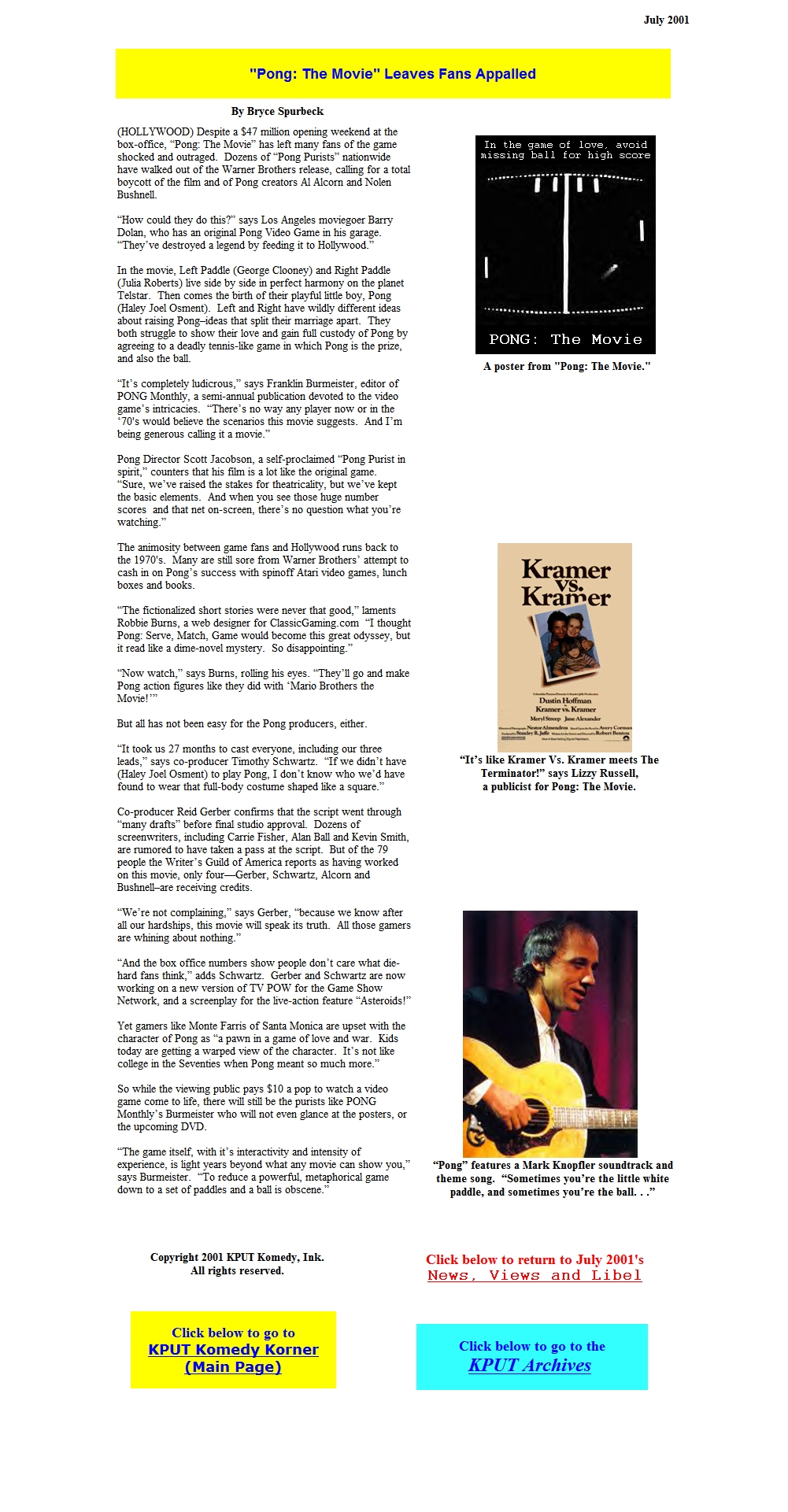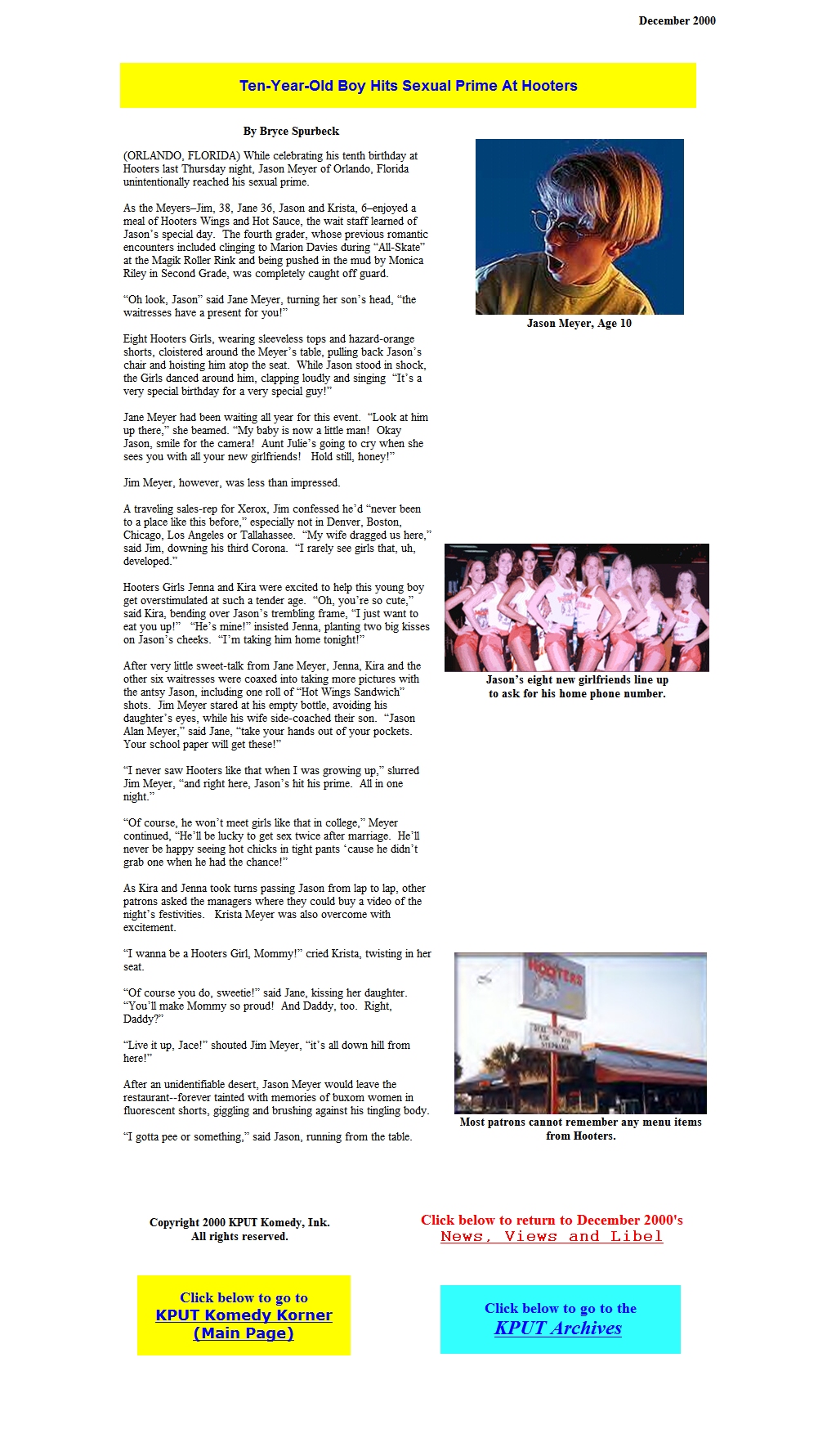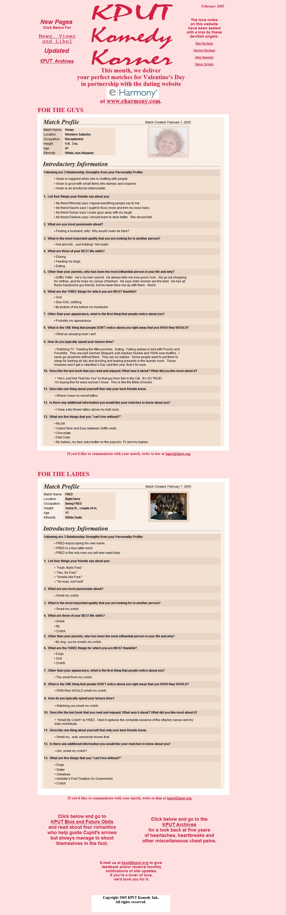 He wrote for Jimmy John's "Ask Jimmy" radio commercials and print ads. And for the past decade, he has written parody and satire for the KPUT Komedy Korner website at www.kput.org (see samples below).
